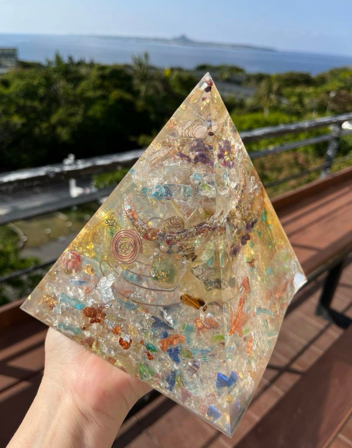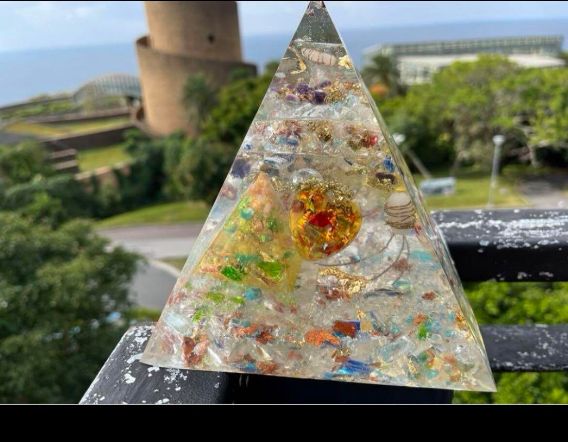 沖縄の自然のエネルギーが宿る特大ピラミッド型琉球オルゴナイトです。開運や引き寄せの力を秘めたこのアイテムは、あなたの人生に幸運をもたらすことでしょう!